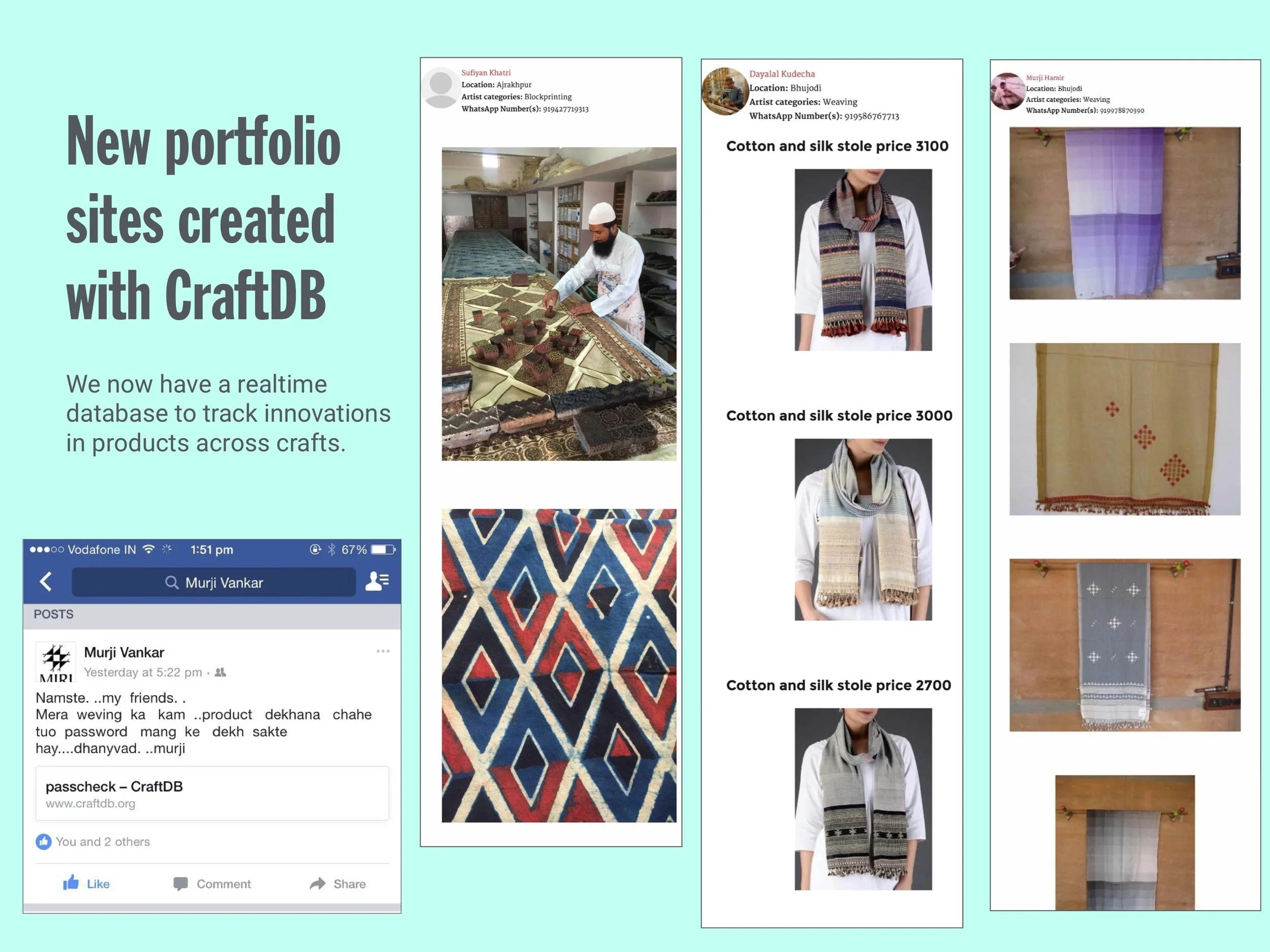 Working with Payam Azadi, a US-based software engineer, I designed and prototyped CraftDB, a tool allowing artisans to upload photos and descriptions of their work to their own online portfolio directly via Whatsapp. Each artisan's portfolio page is password protected. Before leaving India, I conducted training sessions in the community to user test the tool. After a warm reception, it is currently in development.